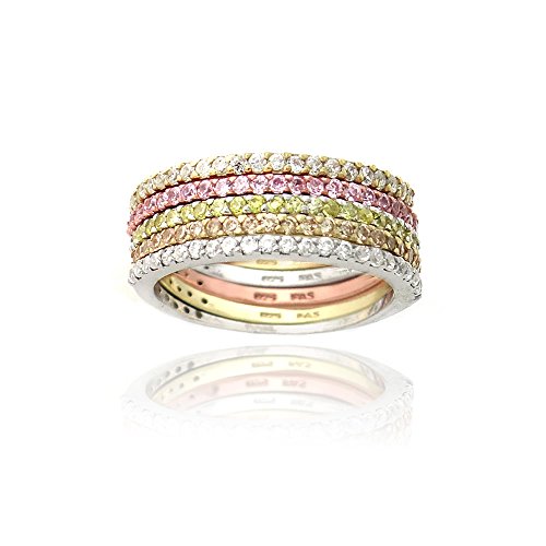 This jewelry set showcases five stackable half-eternity bands rings. They feature a sterling silver band with clear CZ stones, sterling silver band with yellow CZ stones, gold tone over sterling silver band with clear CZ stones, gold tone over sterling silver band with champagne CZ stones and rose gold tone over sterling silver band with light pink CZ stones. You can wear the rings individually or stack em for that real glamorous appearance.